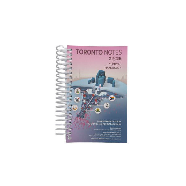 This 2025 edition features substantial content revisions to the text, figures, and graphics of all 32 chapters, following a comprehensive review by our student and faculty editorial team. Up-to-date, evidence-based medicine studies are also summarized in highlighted boxes throughout the text. All chapters reflect the most-updated COVID-19 guidelines. The editors have also approached each chapter with the new MCCQE objectives on providing anti-oppressive health care, and quality improvement and patient safety in mind. In addition to content updates, the Toronto Notes 2025 Clinical Handbook has been updated to prioritize conciseness as well as high-yield content and Do Not Miss Diagnoses to guide your learning during clerkship rotations.