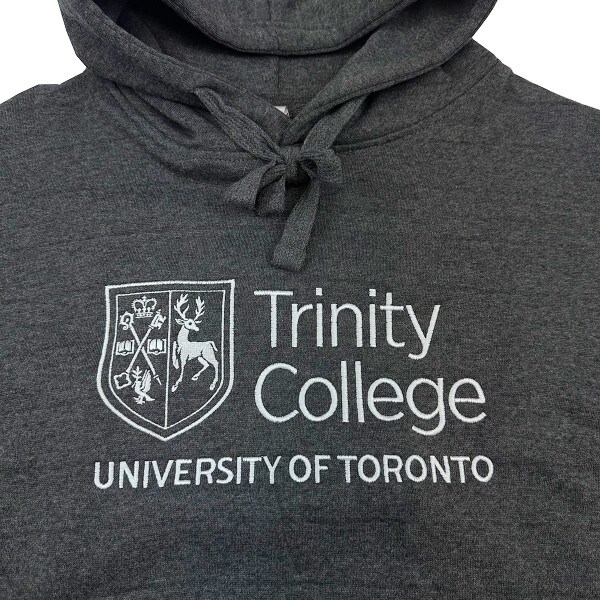 U of T Trinity College Hoodie SKU HOODY:TRINITY EMBR REVERS HTHR CHARCOAL $64.99 Quantity discounts available QuantityPrice (0)No Reviews yet Watchman Process Error Message Watchman Line Id (SCA) Watchman Status Successful Failed Size SMALL MEDIUM LARGE XLARGE XXLARGE Quantity -+ Add to Cart Details Trinity College Signature HoodieProduct Details:Embroidered full Trinity College crest and word mark over U of T word mark on centre c... Details Back DetailsTrinity College Signature HoodieProduct Details:Embroidered full Trinity College crest and word mark over U of T word mark on centre chest.Drawstring hood.Elastic waistband and arm cuffs.Kangaroo pouch pocket.60% cotton, 40% polyester. Ratings & ReviewsNo reviews availableBe the first to Write a Review