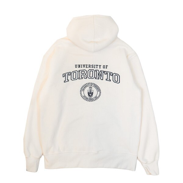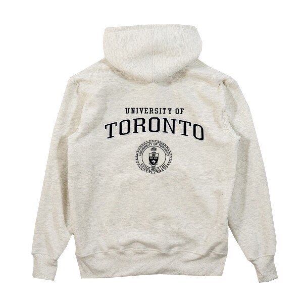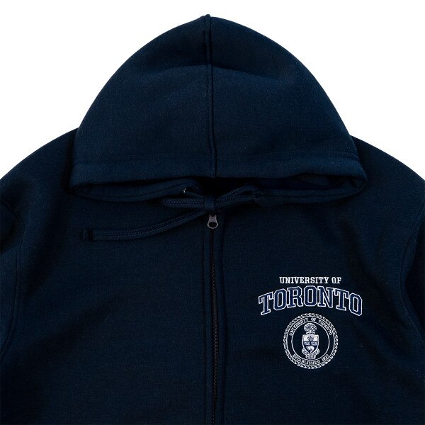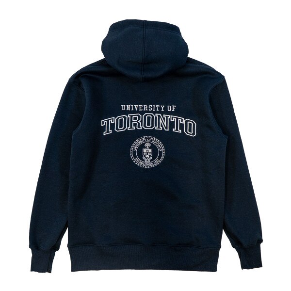 - Embroidered U of T stacked arched word mark over circular signature on left chest and on full centre back.